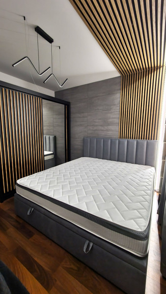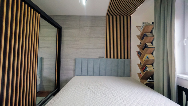 2/ 12,1 mkw sypialnia z dużą szafą i dużym tapicerowanym łóżkiem typu skandynawskiego. W sypialni przewidziano także biurko komputerowe. W oknie roleta wewnętrzna oraz roleta zewnętrzna ocieplana sterowana ręcznie.