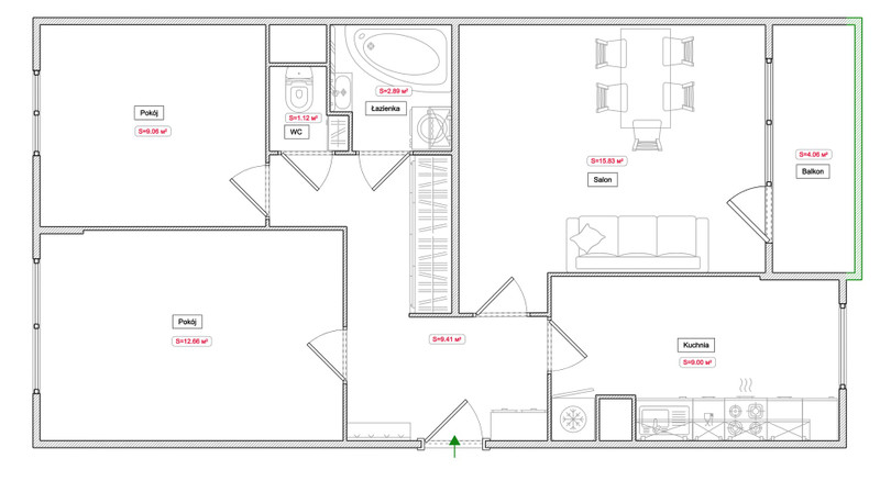 Metraż: 60,22 m² (3 pokoje + osobna kuchnia + łazienka + WC + balkon)