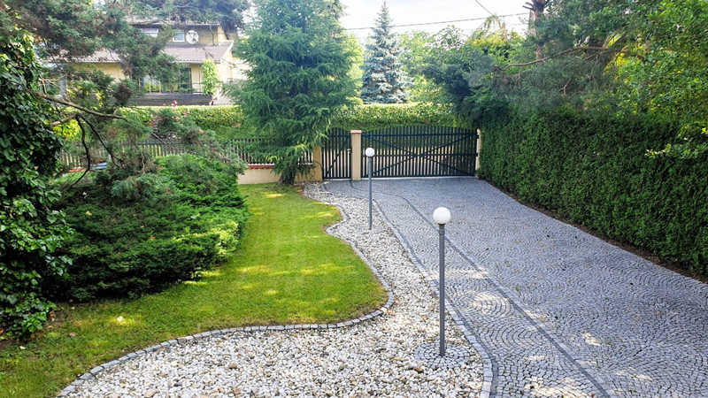Podjazd do posesji z miejscami postojowymi, wyłożony kostką granitową. Schody do budynku wyłożone kostką granitową.