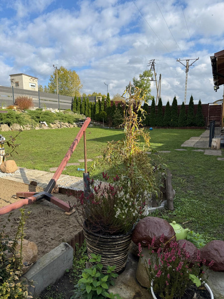Na działce znajdują się rośliny i krzewy ozdobne, miejsce na ognisko i grill, a także drewniana szopa narzędziowa.