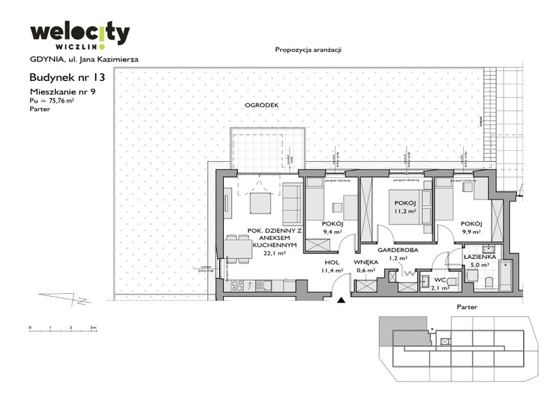 Nieruchomość znajduje się w Gdyni, w dzielnicy Wiczlino, przy ulicy Jana Kazimierza, na nowoczesnym i kameralnym osiedlu Welocity. Jest to jedna z najbardziej pożądanych lokalizacji w tej części miasta, szczególnie ceniona przez rodziny oraz osoby poszukujące spokoju i bliskości natury.