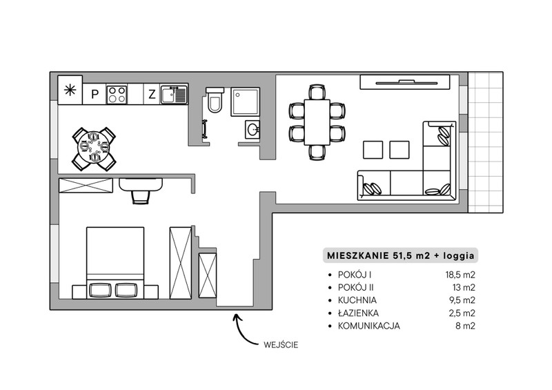 • W pełni rozkładowe, 2 pokojowe mieszkanie o powierzchni 51,39m²