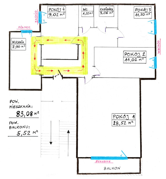 Mieszkanie, od chwili budowy, posiada UNIKALNY UKŁAD 4 pokoi ( zaznaczony na żółto w rzucie poziomym ) ze względu na POKÓJ o pow. 9 m2 – PRZECHODNI wokół centralnej ściany mieszkania . Oznacza to że obecnie ten pokój może służyć zarówno jako rodzinna jadalnia obok kuchni, gościnny czy gabinet, jak i sypialnia – w zależności od potrzeb ( oczywiście, zamiast przejścia , można wstawić ściankę) .