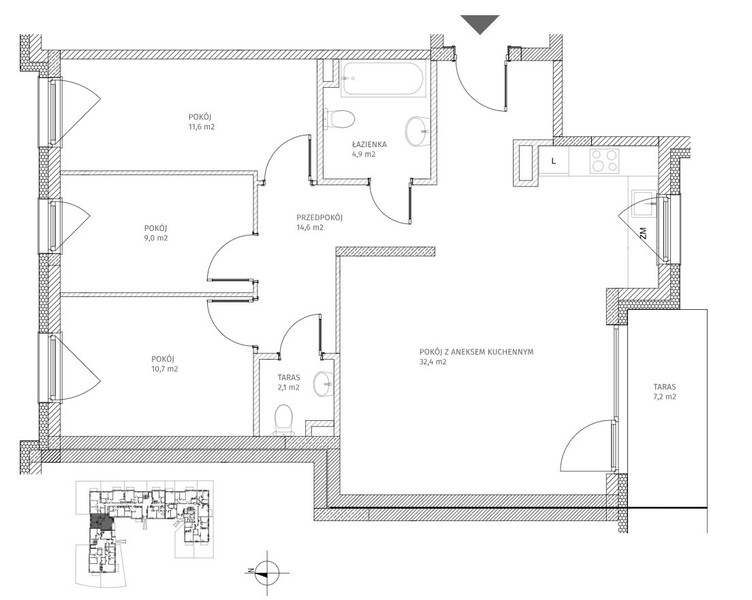 Mieszkanie składa się z 3 ustawnych sypialni, pokoju dziennego z możliwością wyodrębnienia osobnej kuchni, sporego korytarza, łazienki oraz spiżarni/pralni zaadoptowanej z drugiej łazienki.