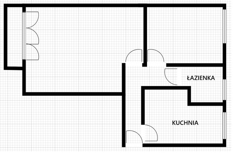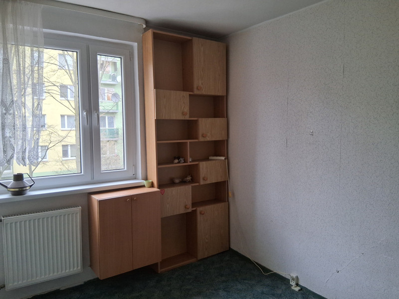 Pomieszczenia: pokój duży - okno na płd; pokój mały, kuchnia i łazienka - okna na płn; przedpokój w kształcie litery L (przy drzwiach wejściowych po prawo kuchnia, na wprost drzwi wejściowych wejście do dużego pokoju, z krótszego przedpokoju wejście do małego pokoju i łazienki (patrz zdjęcia)