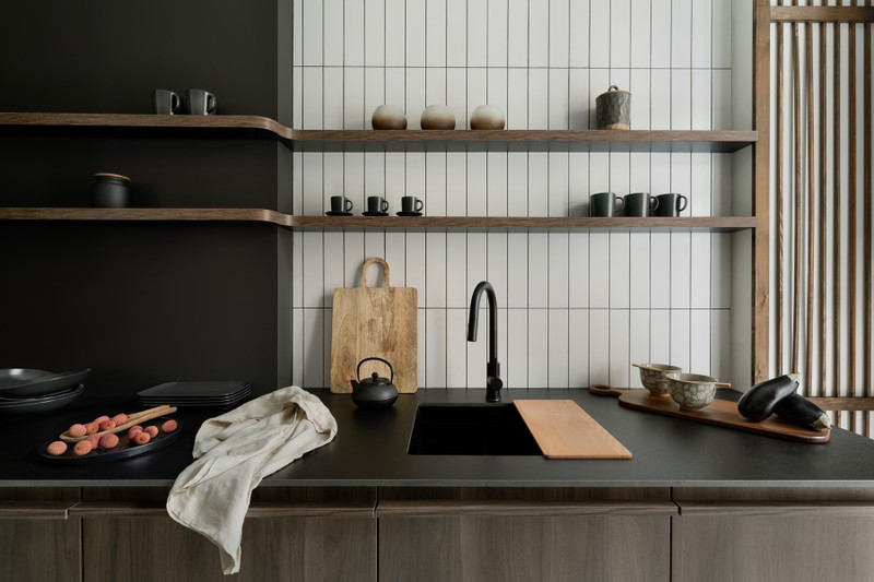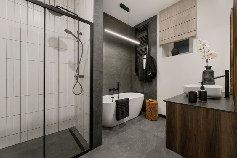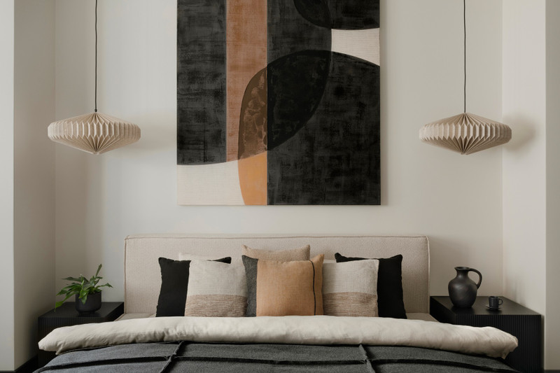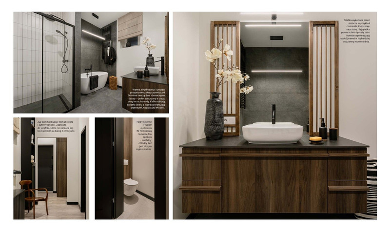 Myśląc o tym, wędrujesz do łazienki, w której szykujesz sobie kąpiel. To jedna z najprzyjemniejszych chwil dnia. I znowu uśmiechasz się sama do siebie, odstawiając sól morską na drewnianym pieńku. Masz przecież mini SPA na wyłączność, przestrzeń, kojące barwy i wygodę. W ogóle w tym wnętrzu odzyskałaś siebie. Tak wiele elementów sprawia, że się zatrzymujesz, odzyskujesz klarowność myślenia i siłę. Uwielbiasz patrzeć na obraz Roberta Przybysza, ustawiony naprzeciwko sofy. To taki Twój symbol kontemplacji – czarna kula na tle płótna przypomina o japońskim ensō, kręgu pełnym znaczeń. Jest niczym malarska medytacja, wokół której koncentruje się energia całego pomieszczenia. I te momenty zatrzymania uwielbiasz.