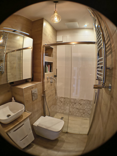 W pełni wyposażona łazienka z prysznicem tropikalnym .