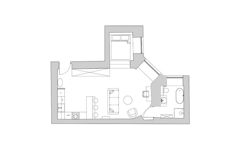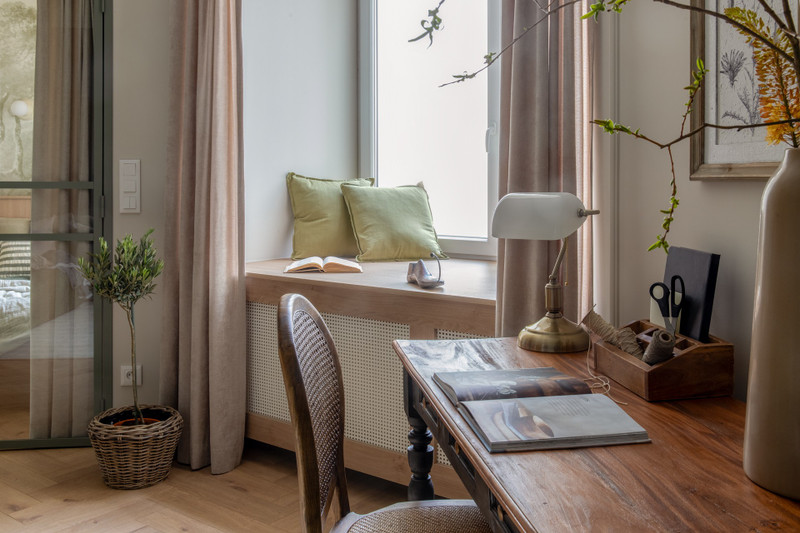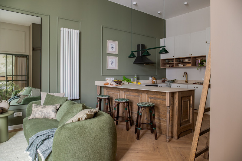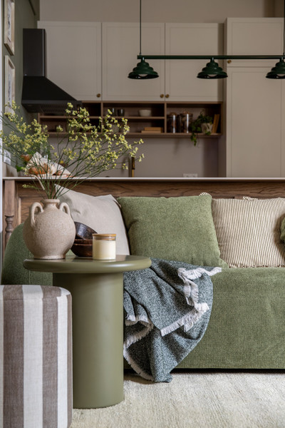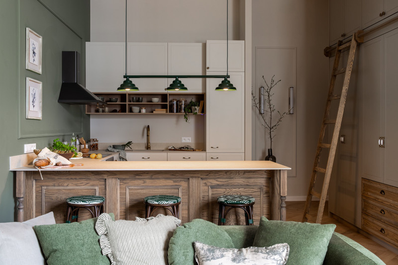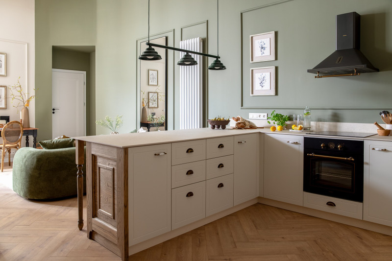 Na niewielkim metrażu udało się stworzyć przestrzeń niezwykle piękną, komfortową i funkcjonalną: salon z aneksem kuchennym, wydzieloną wnękę sypialnianą, miejsce do pracy oraz łazienkę z wanną i prysznicem. Wysokie wnętrza, subtelna sztukateria, naturalne drewno, przygaszona szałwia, miękkie tkaniny i starannie dobrane detale budują atmosferę spokoju i wyciszenia — jakby to mieszkanie naprawdę mówiło ciszej niż reszta miasta.