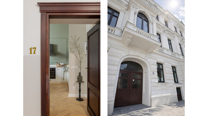 Szałwiowy Szept to wyjątkowe mieszkanie o powierzchni 43,43 mkw, położone na II piętrze pięknie zrewitalizowanej kamienicy z 1893 roku. Budynek zachwyca swoją neoklasyczną architekturą z mocnymi zdobieniami. Jego fasadę wzbogaca oryginalna sztukateria z popiersiem kobiety między oknami. Mieszkanie znajduje się w reprezentacyjnej, frontowej części, a prowadzą do niego dębowe schody z żelazną balustradą lub nowoczesna winda. Mozaika na posadzce oraz piękna, stylizowana stolarka drzwiowa zachwycają od przekroczenia progu kamienicy.