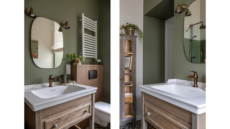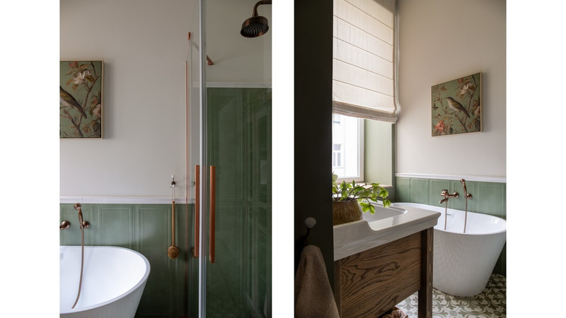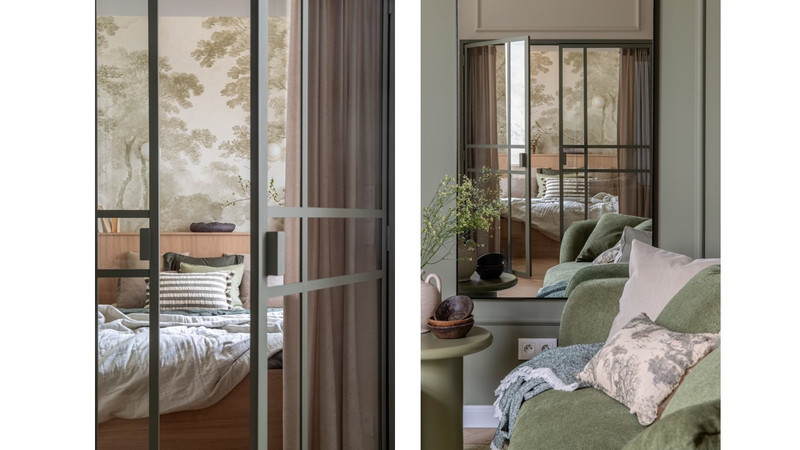 Kuchnia zachwyca elegancką zabudową i wyspą o niemal butikowym charakterze z blatem ze spieku kwarcowego. Część dzienna jest przytulna, ale wyrafinowana, z piękną zielenią ścian i zabudową wykorzystującą wysokość wnętrza. Przeszklone drzwi do strefy sypialnianej dodają lekkości i charakteru, a samo miejsce do spania pozostaje intymne i nastrojowe spowite koronami drzew rycinowej tapety. Na osobną uwagę zasługuje również łazienka — dopracowana, stylowa, z wolnostojącą wanną, prysznicem i detalami, które nadają jej niemal domowego, angielskiego wdzięku.