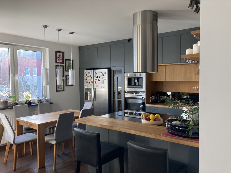 Mieszkanie ma salon z otwartą kuchnią w pełni wyposażoną w sprzęt AGD ( samsung i teka) oraz lodówka z kostkarką firmy Samsung.