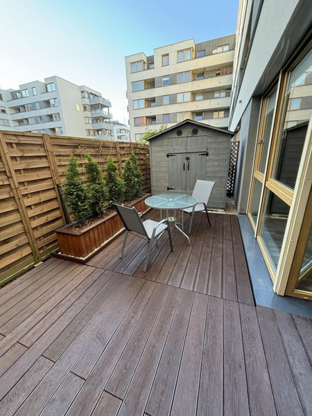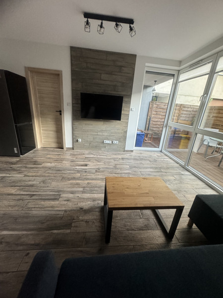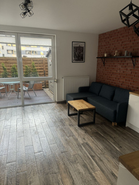 • Salon z aneksem kuchennym – 16 m², wyjście do większego ogródka – 23 m², z tarasem i meblami ogrodowymi