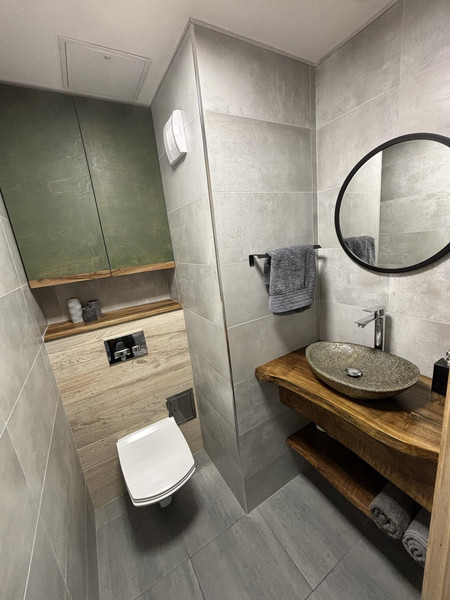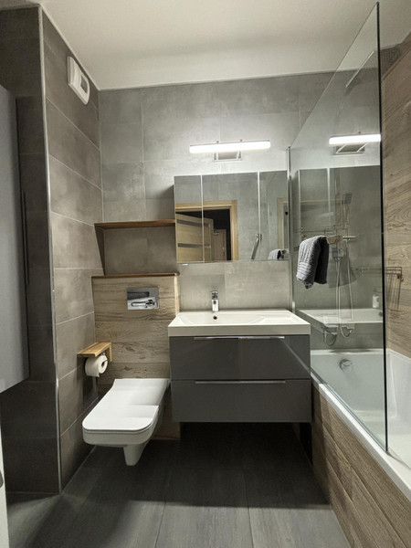 Łazienka z wanną/prysznicem, toaletą, szafkami i pralką. Osobne WC z toaletą, umywalką nablatową i szafkami. w obydwu pomieszczeniach blaty z orzecha włoskiego.