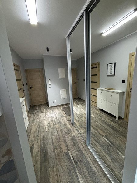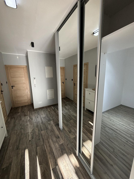 Przedpokój z dużą, lustrzaną szafą przesuwną i schowkiem.