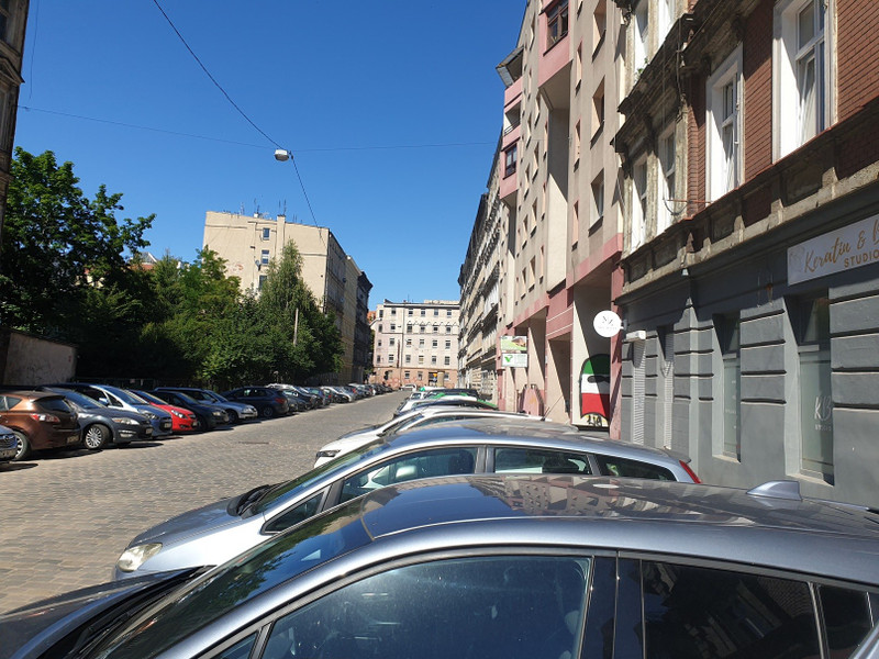 Miejsca parkingowe na wewnętrznym podwórku oraz dużo miejsc parkingowych przy ulicy przed kamienicą.
