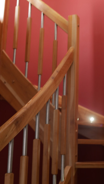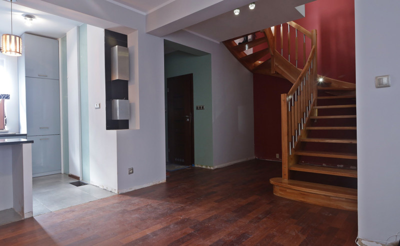 Lokal posiada odrębne i samodzielne wejście od strony patio, składa się z dużej strefy dziennej (salon z aneksem kuchennym) i toalety - na parterze oraz dwóch komfortowych sypialni, dużej łazienki (z oknem) i garderoby na piętrze. Mieszkanie noszące ślady użytkowania, zadbane, czyste, jasne z dużym potencjałem. W salonie parkiet – drewno egzotyczne merbau, schody drewniane, w pozostałych pokojach nowe panele. Możliwość wprowadzenia się bez znaczącego nakładu finansowego.