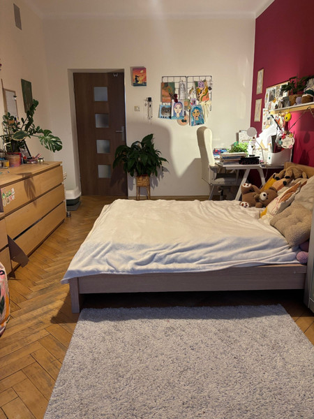 W sypialni (20m) szafa Ikea i duże podwójne łóżko.