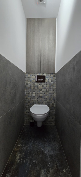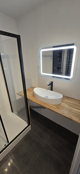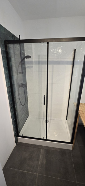 • Nowoczesna łazienka z dużą kabiną prysznicową .