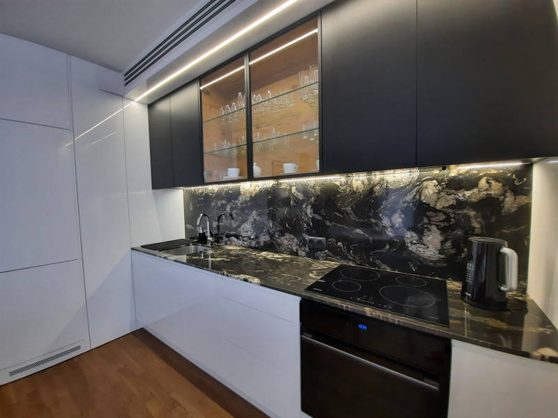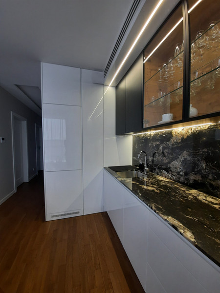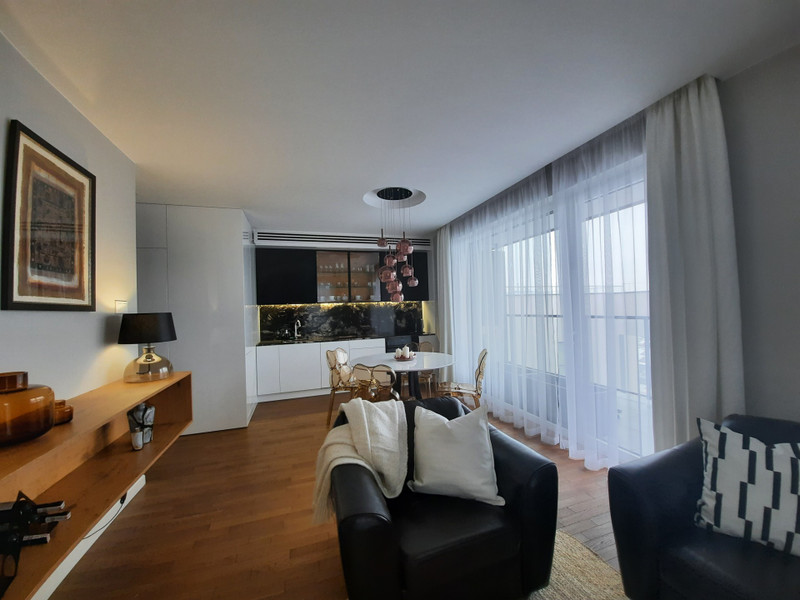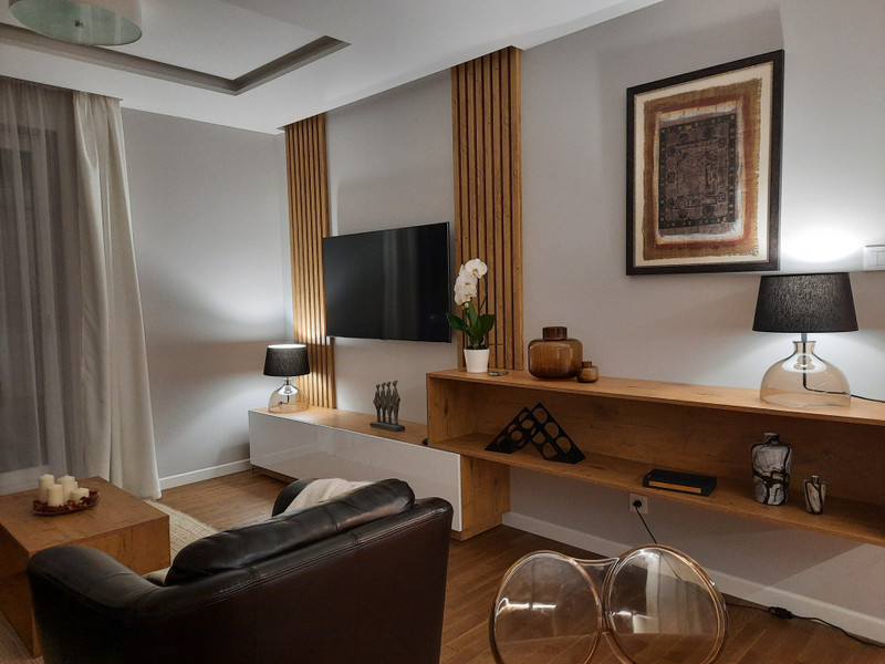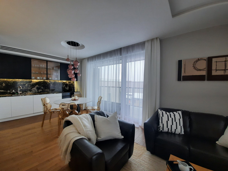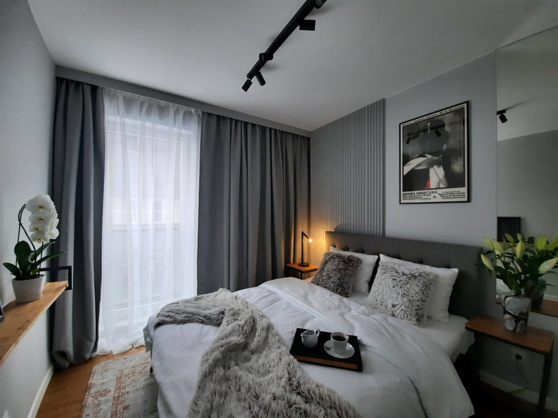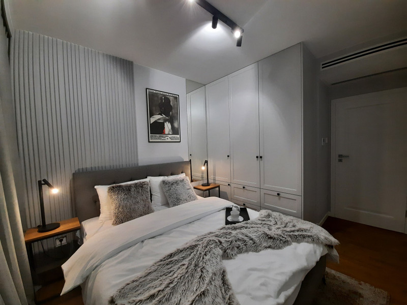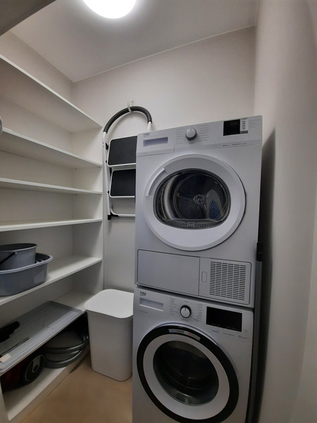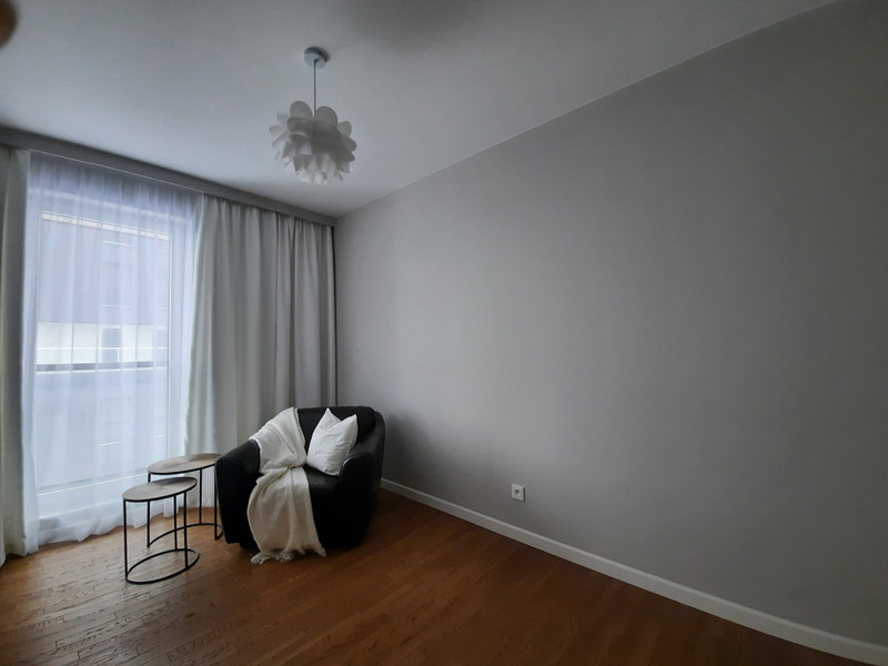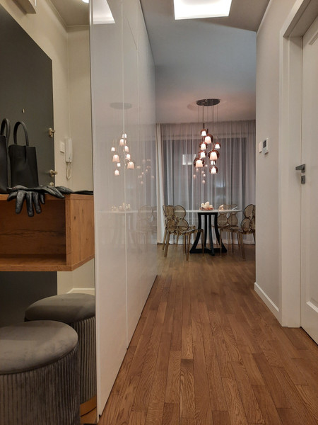 Sprzedam słoneczne mieszkanie z oknami na południe i zachód, osłoniony balkon od południa. Salon z aneksem kuchennym plus 2 sypialnie, łazienka i pomieszczenie gospodarcze. Do zamieszkania, kompletnie wyposażone, wykończone w wysokim standardzie. Podłoga z drewna olejowanego, granitowe blaty i parapety, wysokiej klasy armatura łazienkowa, klimatyzacja. Wyposażenie widoczne na zdjęciu sprzedawane razem z mieszkaniem - zabudowa pod wymiar, kanapa, stół, krzesła, łóżko, dywany, pralka i suszarka BECO. W kuchni płyta indukcyjna z piekarnikiem, duża lodówko-zamrażarka w zabudowie, zmywarka, telewizor - wszystkie marki SAMSUNG. Na balkonie stolik plus 2 krzesła i donice na kwiaty. Używane ale w doskonałym stanie. Wszystkie sprzęty sprawne. Mieszkanie będzie odświeżone przed sprzedażą (malowanie, impregnacja podłogi, sprzątanie).