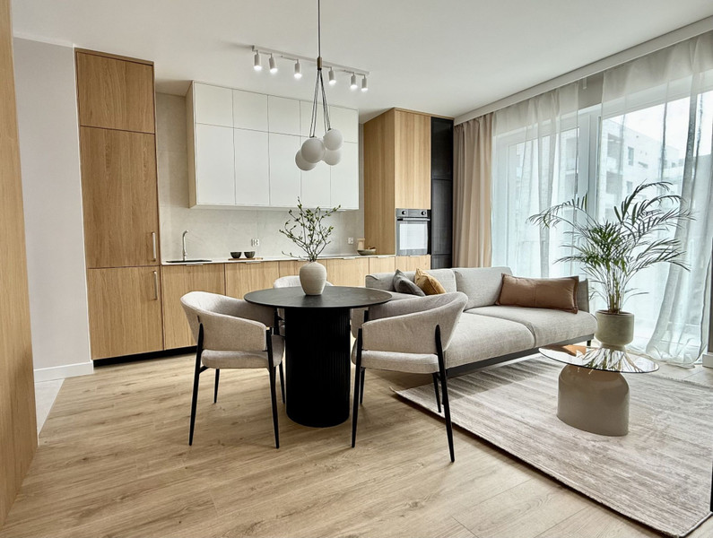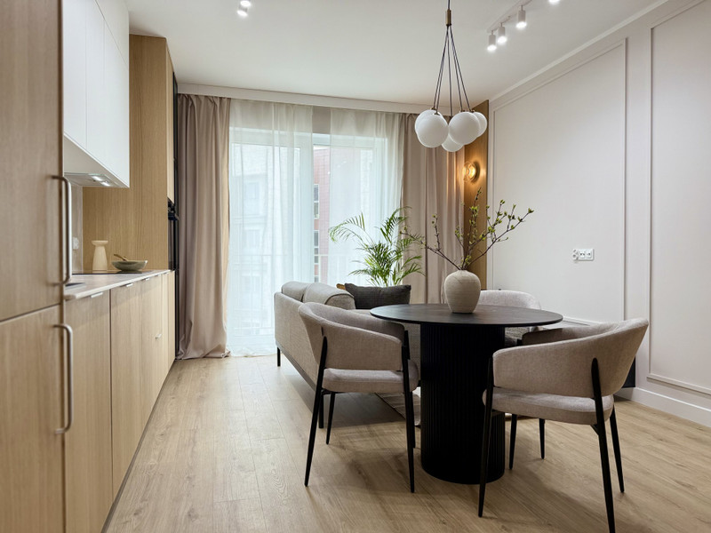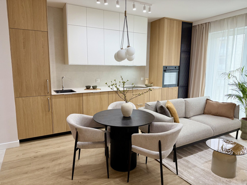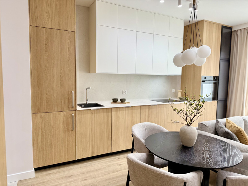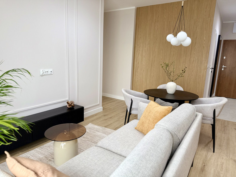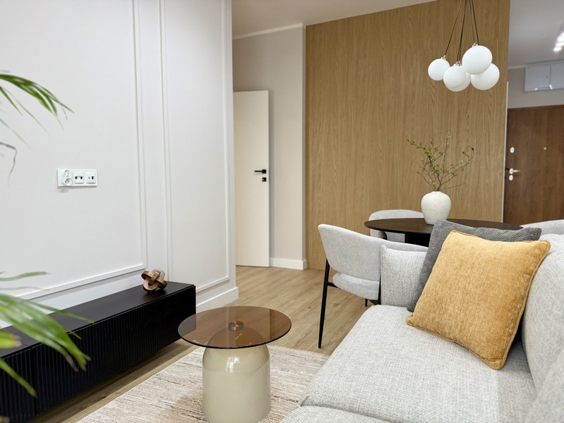 Mieszkanie o powierzchni 49,10m2, składa się z jasnego salonu z aneksem kuchennym, sypialni, dużej garderoby ze szklaną ścianą, dzięki czemu można zagospodarować ją na dodatkowy pokój, łazienki, pralni z miejscem na pralkę i suszarkę oraz przedpokoju z dużą szafą. Do mieszkania przynależy balkon o powierzchni 11 m2. Kuchnia jest kompletnie wyposażona w zabudowę meblowa oraz niezbędne sprzęty (płyta indukcyjna, zmywarka, piekarnik, lodówka, zlew, okap), które są wliczone w cenę mieszkania. Zarówno fronty kuchenne, jak i stół w salonie są wykonane z drewna. W łazience znajduje się kabina prysznicowa, WC oraz szafka z umywalką, nad która zostało zmontowane duże lustro. Dzięki temu, że mieszkanie ma wysokość 2,70m, a wszystkie okna skierowane na stronę południową, jest bardzo jasne, ciepłe i przestronne.