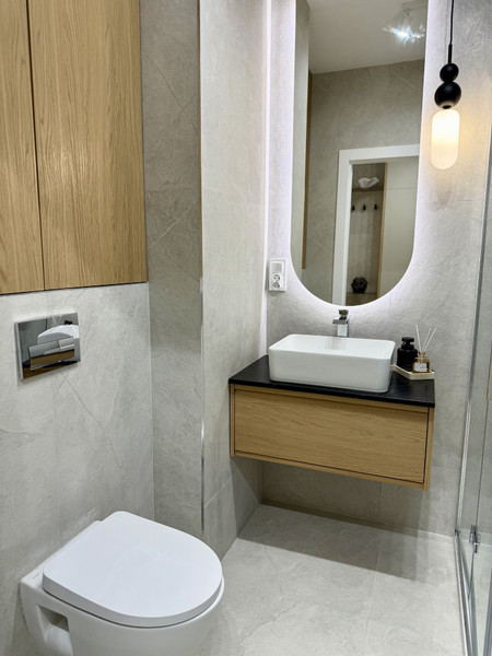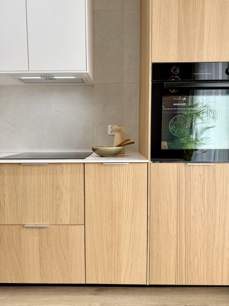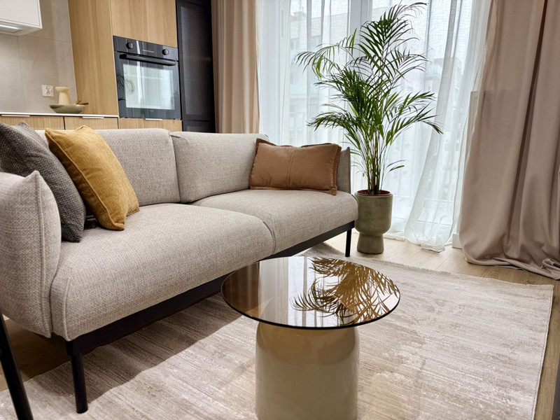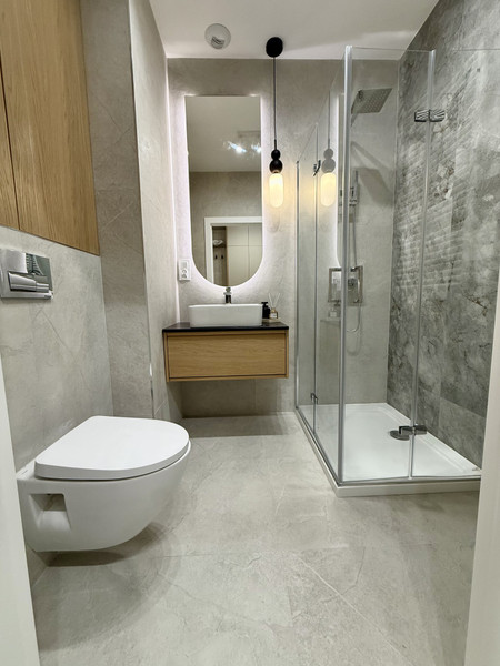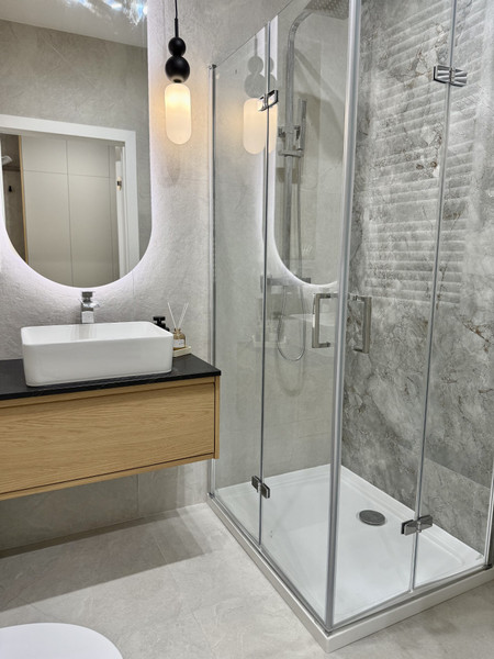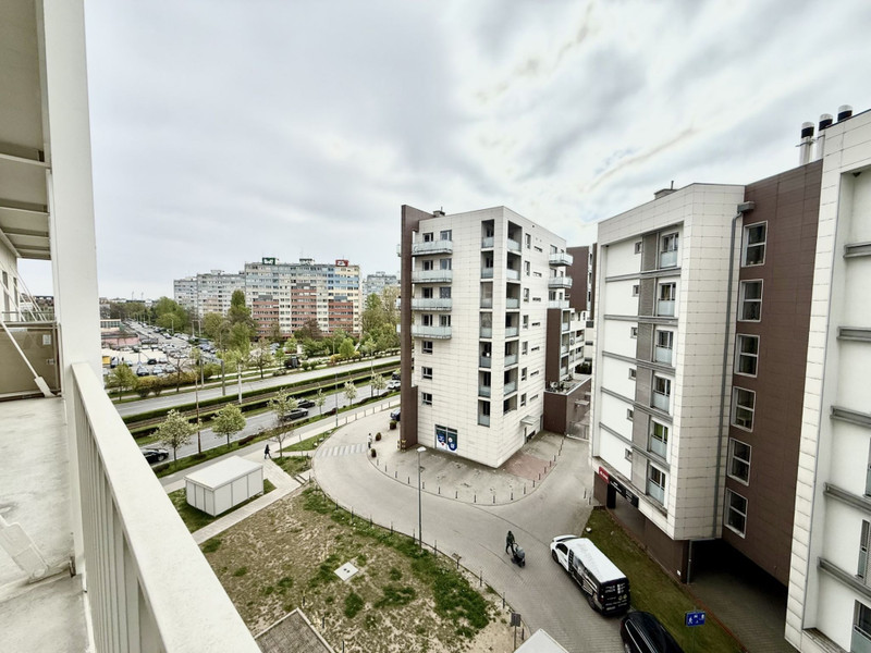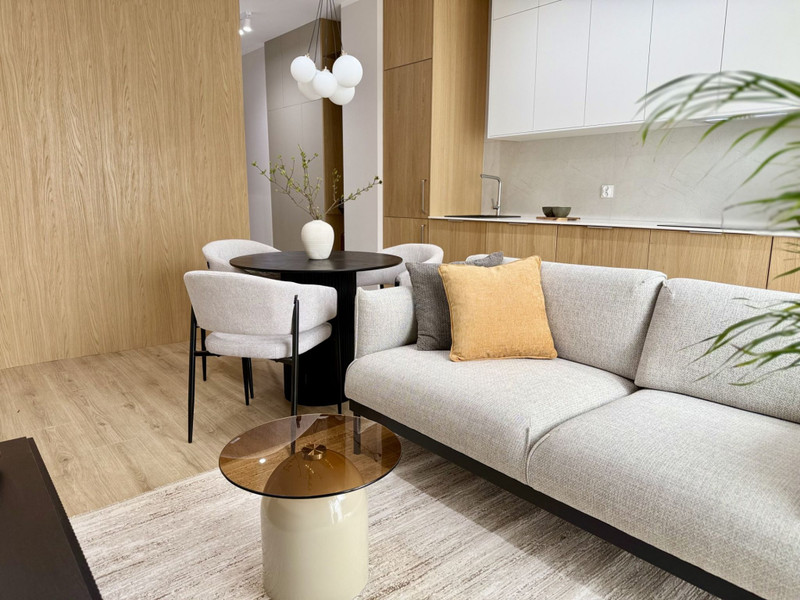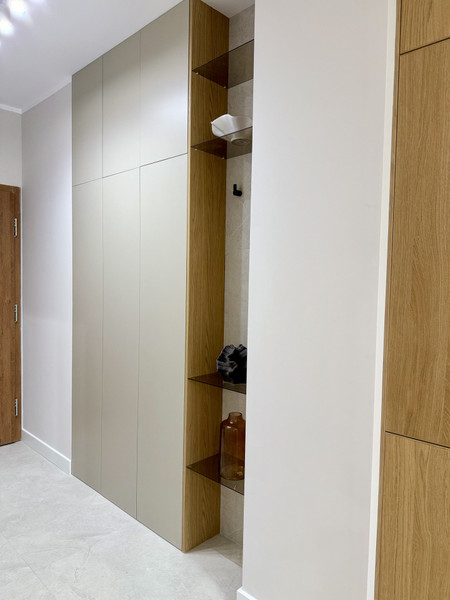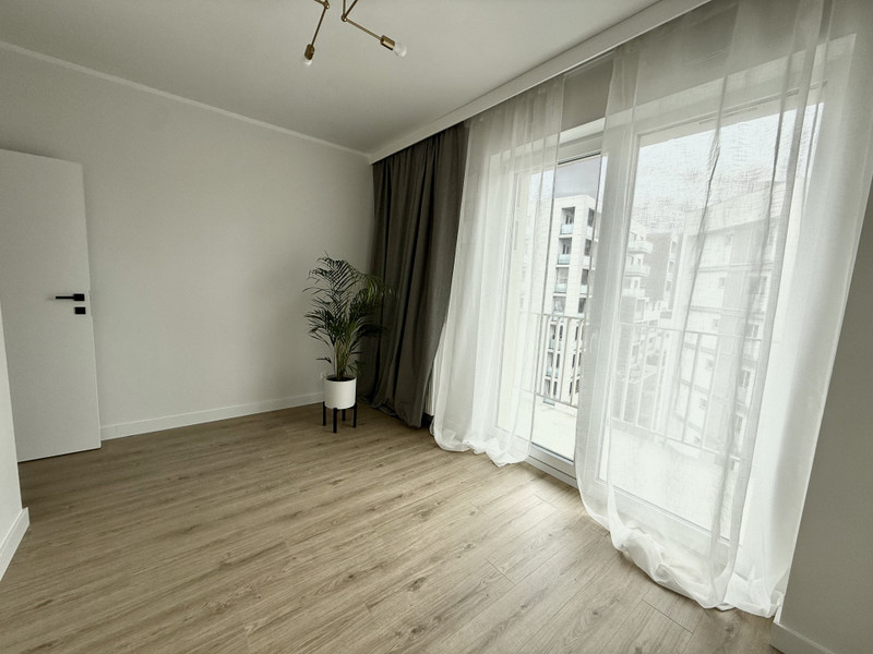 Mieszkanie o powierzchni 49,10m2, składa się z jasnego salonu z aneksem kuchennym, sypialni, dużej garderoby ze szklaną ścianą, dzięki czemu można zagospodarować ją na dodatkowy pokój, łazienki, pralni z miejscem na pralkę i suszarkę oraz przedpokoju z dużą szafą. Do mieszkania przynależy balkon o powierzchni 11 m2. Kuchnia jest kompletnie wyposażona w zabudowę meblowa oraz niezbędne sprzęty (płyta indukcyjna, zmywarka, piekarnik, lodówka, zlew, okap), które są wliczone w cenę mieszkania. Zarówno fronty kuchenne, jak i stół w salonie są wykonane z drewna. W łazience znajduje się kabina prysznicowa, WC oraz szafka z umywalką, nad która zostało zmontowane duże lustro. Dzięki temu, że mieszkanie ma wysokość 2,70m, a wszystkie okna skierowane na stronę południową, jest bardzo jasne, ciepłe i przestronne.
