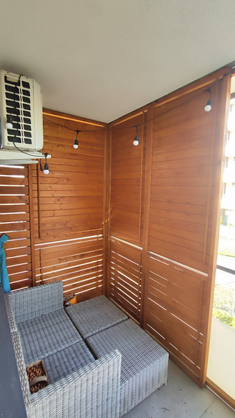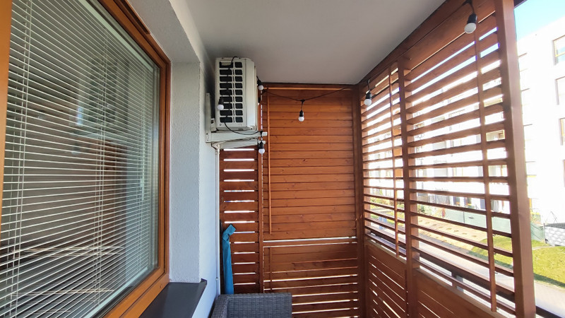 - Balkon częściowo zabudowany (drewniane żaluzje umożliwiające otwieranie i zamykanie).
