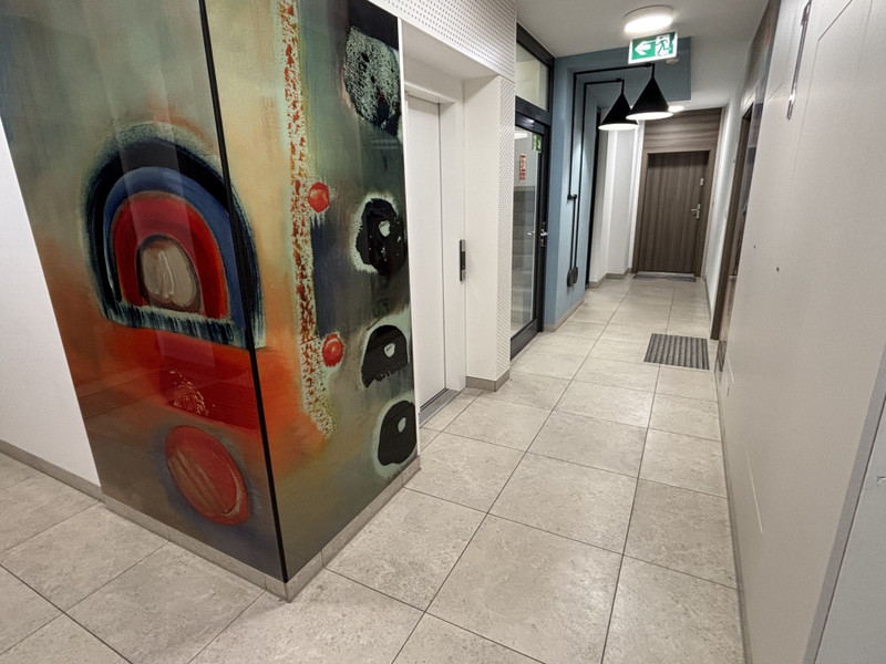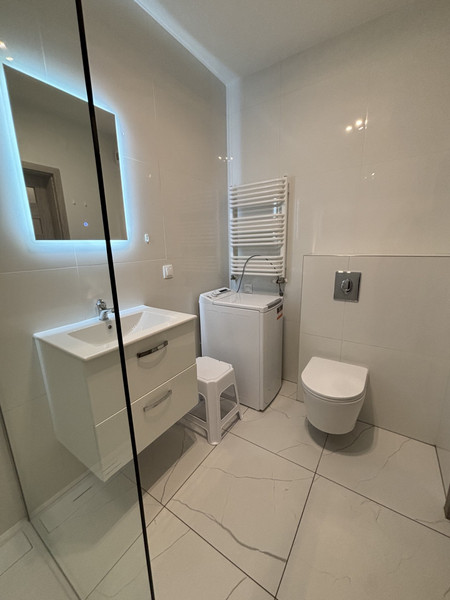 Mieszkanie jest jasne, bardzo słoneczne i ciepłe. Składa się z dwóch pokoi (pokój dzienny z aneksem kuchennym, sypialnia) oraz łazienki z kabiną prysznicową i pralką, balkonu z widokiem na południowy zachód. W budynku szybkobieżna winda.