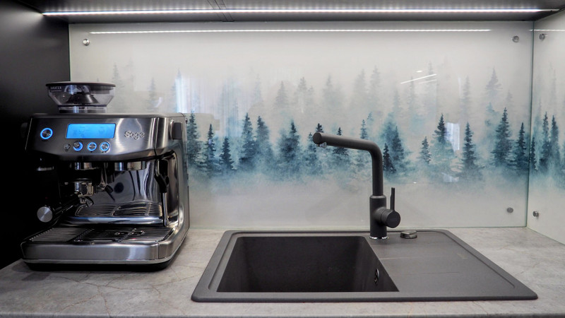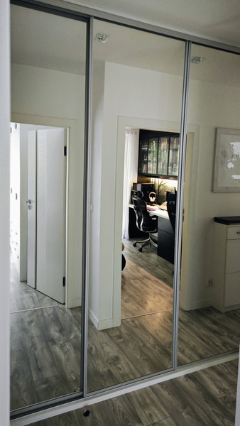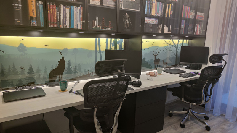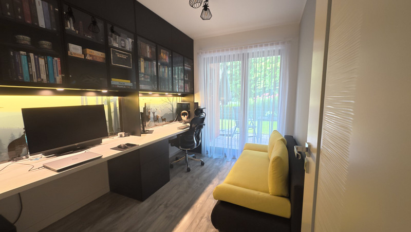 - Biuro (9,5 m²) - wyposażone w nowoczesną meblościankę robioną na wymiar, na którą składają się dwa duże biurka, 3 szuflady oraz półki nad biurkami. Na ścianie przy biurkach szkło dekoracyjne z oświetleniem LED.