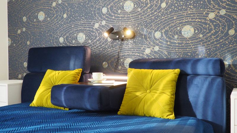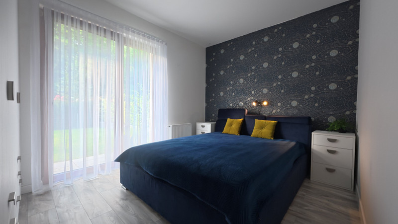- Sypialnia (12 m²) - wyposażona w łóżko kontynentalne, pojemną szafę robioną na zamówienie oraz dwa stoliki nocne do kompletu (w cenie mieszkania).