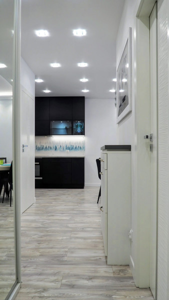 - Przedpokój (8 m²) - składa się z pojemnej szafy w zabudowie oraz dodatkowej szafki na buty, która stylistycznie nawiązuje do komody w salonie (w cenie mieszkania).