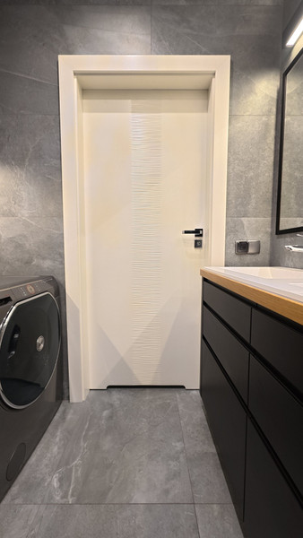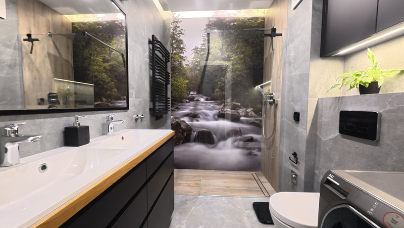 - Łazienka (5 m²) - wyposażona jest w podwójny zlew na blacie drewnianym (dąb), pod zlewem dwie niższe szuflady na różne drobiazgi jak np. suszarka do włosów oraz dwie wysokie, które świetnie sprawdzają się jako brudownik. Poza tym w łazience znajduje się WC z funkcją bidetu (2w1) oraz pralka. Mechanizm spłukujący bezdotykowy. Nad pralką i WC dodatkowa szafka z półkami ręcznie malowane z podświetleniem LED. Elektrycznie podgrzewana podłoga.