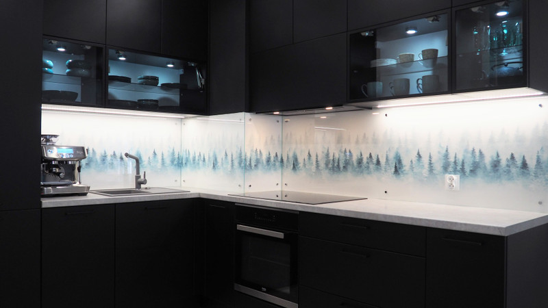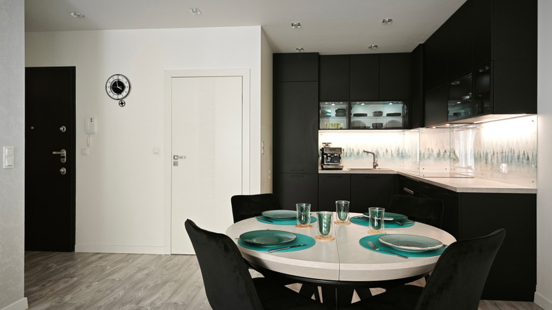 - Salon z aneksem (29 m²) - kuchnia wykonana jest w wysokim standardzie, szafki i szuflady z mechanizmami / akcesoriami Blum. Szuflada pod zlewem elektrycznie otwierana na dotyk. Czarne matowe fronty akrylowe. Pod szafkami i w witrynach lampki LED. Komoda w salonie wykonana jest z drewna (jesion) i zawarta jest w cenie mieszkania.