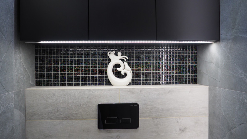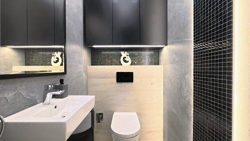 - Ubikacja (2,5 m²) - również wyposażona w WC z funkcją bidetu (2w1) oraz bezdotykowy mechanizm spłukujący. Nad WC dodatkowa szafka z półkami ręcznie malowane z podświetleniem LED.