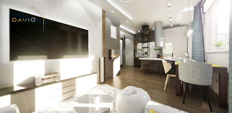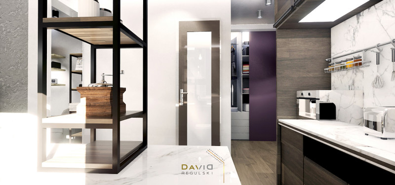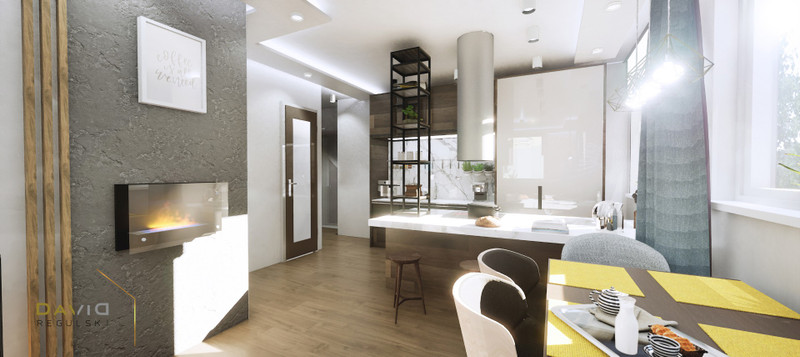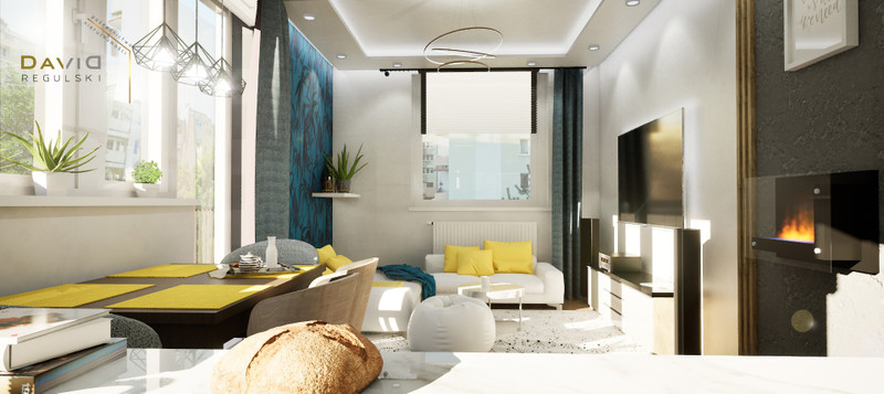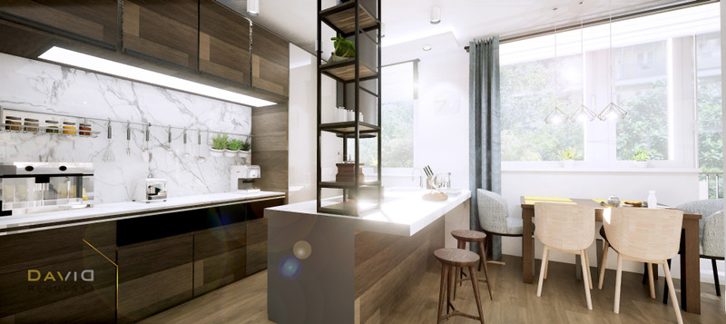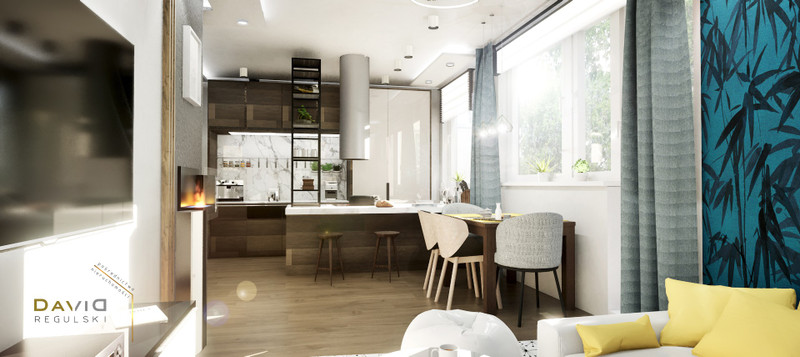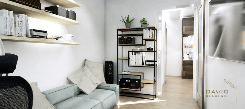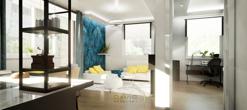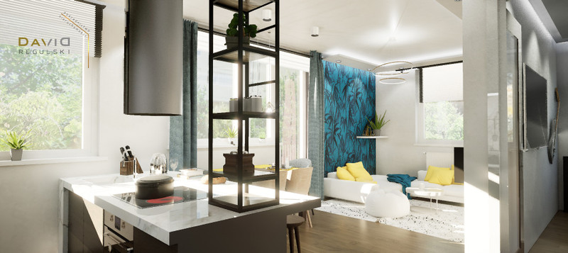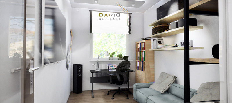 Atutem jest też bogata możliwość aranżacji układu pomieszczeń. Obecny stan zawiera dwa niezależne pokoje z odrębną kuchnią. Wszystkie pomieszczenia posiadają niezależne wejścia z jasnego przedpokoju. Dla zwolenników aneksu i wyspy kuchennej sporządziliśmy również wizualizację 3D układu alternatywnego, nadającego ton nowoczesności z jeszcze większą ilością przestrzeni i światła. Ten wstępny projekt może posłużyć jako inspiracja dla nowego Właściciela.