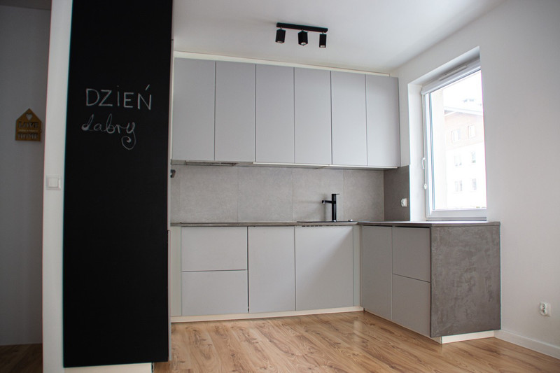 Mieszkanie składa się z ustawnego salonu z aneksem kuchennym wyposażonym we wszystkie potrzebne sprzęty AGD (lodówka, płyta grzewcza, piekarnik, zmywarka). Kuchnia ma nowe fronty i duży blat, doskonały dla wielbicieli gotowania, wykonany z bardzo praktycznego w użyciu, betonu architektonicznego. Mieszkanie jest w bardzo dobrym stanie, zostało odmalowane i odnowione. Salon jest jasny i ustawny, z dużymi oknami i miejscem na stół, szafkę RTV i dużą narożną kanapą, z której można cieszyć się widokiem na zieleń. Mieszkanie ma dobrze zaaranżowaną przestrzeń z myślą o miejscu do przechowywania. W sypialni znajduję się duża garderoba w zabudowie, szafki i podwójne łóżko również z miejscem do przechowywania. W przedpokoju również znajduję się szafa i wieszak na ubrania. Łazienka jest wyposażona w wannę z prysznicem-deszczownicą oraz pralko-suszarką. Duży balkon 10 m2 zapewnia miejsce do relaksu i porannej kawy z widokiem na zieleń i drzew. Mieszkanie doskonałe dla pary, singla czy osoby starszej.
