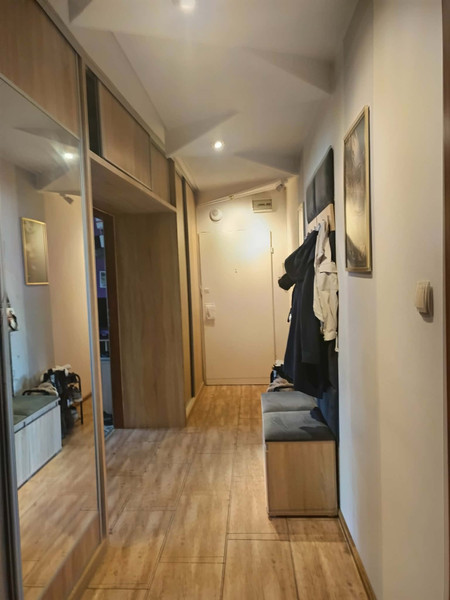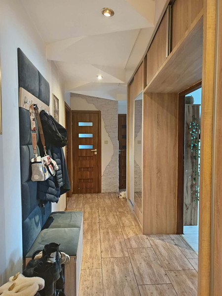 W przedpokoju znajdują się pojemne szafy przesuwne z lustrem, które zapewniają dużo miejsca do przechowywania.