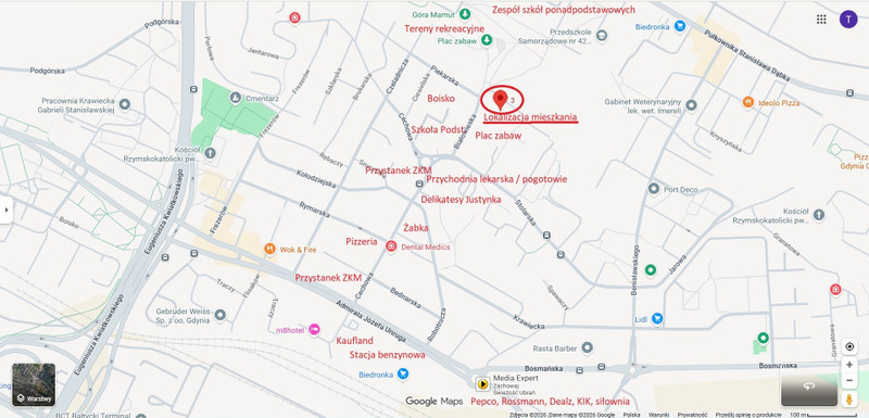 Mieszkanie znajduje się w bardzo spokojnej okolicy, która zapewnia wszystkie wygody niezbędne do życia. W promieniu kilkuset metrów znajdują się m.in.: szkoła podstawowa i ponadpodstawowa, przedszkola, punkty usługowe, sklepy (Kaufland, Lidl, 2 x Biedronka, Delikatesy Justynka, Żabka, Pepco, Rossmann, Dealz, KIK itd.), pizzerie, stacja benzynowa, siłownia Just Gym, przystanki komunikacji publicznej etc. Blisko do plaży w Babich-Dołach oraz do bulwaru i plaży na Oksywiu.
