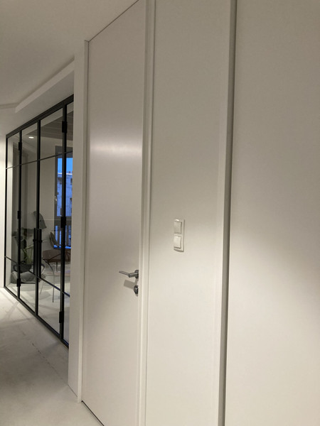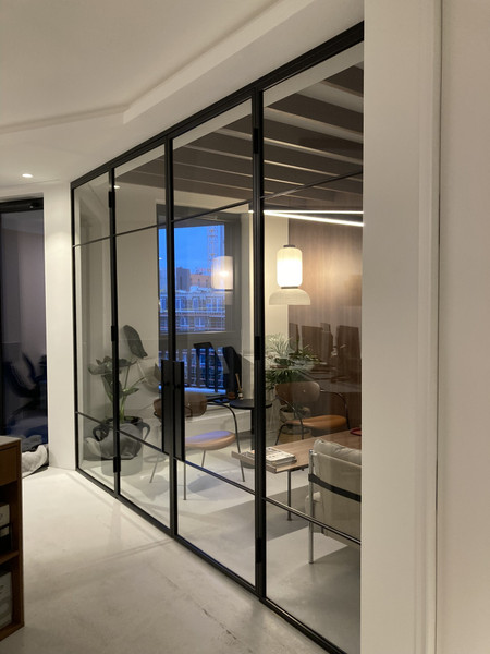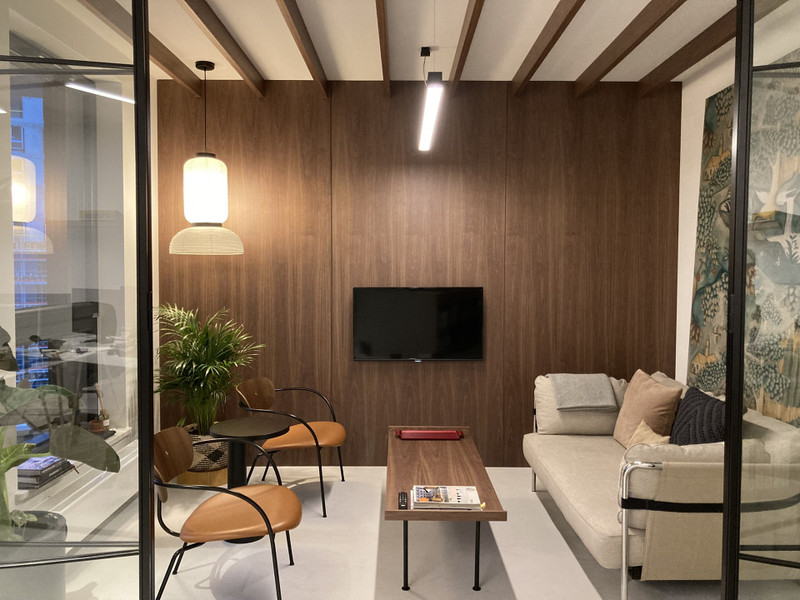 Pokój konferencyjny oddzielony od przestrzeni otwartej zabudową stalowo-szklaną, frontowa ściana pokoju wykonana w naturalnej okleinie orzechowej.