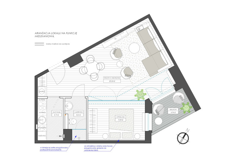 Lokal urządzony jest pod usługę biurową ale przy niewielkim nakładzie prac łatwo i szybko można przekształcić go na funkcję mieszkaniową (układ oraz podłączenia przygotowane są pod funkcję mieszkaniową, załączony rzut adaptacji)