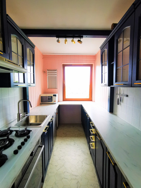 - Duża kuchnia z oknem, wyposażona w AGD - lodówka, zmywarka, piekarnik, kuchenka 5 palnikowa i ponad 5 metrów blatów roboczych, zabudowa meblowa z litego drewna