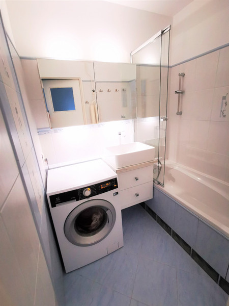- Łazienka z wanną przystosowaną do brania prysznicu, umywalką i pralką