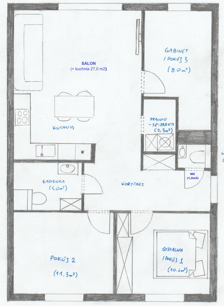 • Bardzo funkcjonalny rozkład – 3 pokoje + salon z kuchnią + łazienka + WC + pralnio-spiżarnia!