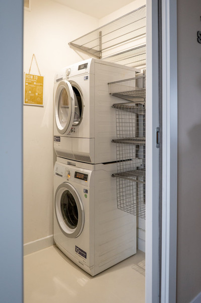 • Ścienny system regałowy Elfa – kosze na brudne ubrania, akcesoria, slot na odkurzacz podłączony "na stałe"