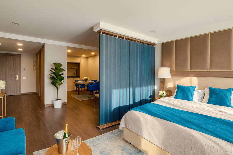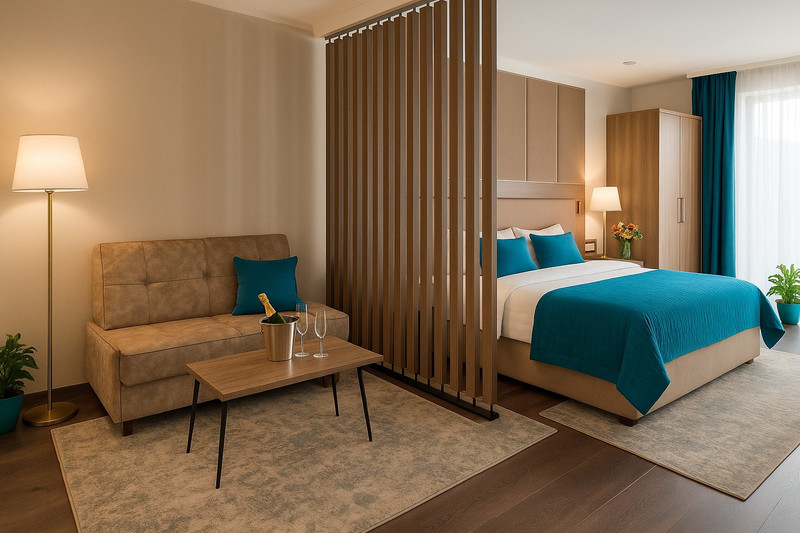 Wnętrze podzielono na funkcjonalne strefy: sypialnianą z dużym łóżkiem, dzienną z aneksem kuchennym, łazienkę z prysznicem oraz hol z obszerną szafą. Apartament oferuje dwa łóżka, w tym jedno rozkładane, a także stoły, fotele, krzesła, konsolę i zestaw mebli balkonowych. Wyposażenie obejmuje klimatyzację, telewizor, pralkę, podgrzewacz wody (termę), lodówkę, sejf, czajnik elektryczny oraz niezbędne akcesoria kuchenne.
