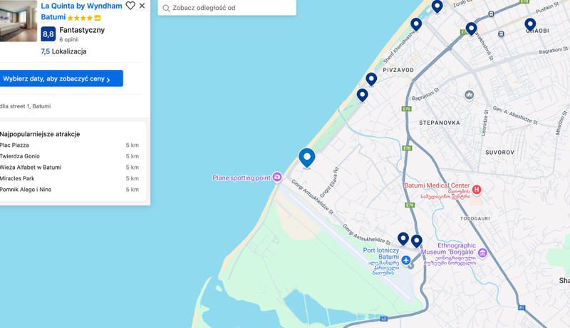 La Quinta by Wyndham Batumi znajduje się w jednej z najbardziej atrakcyjnych i dynamicznie rozwijających się części miasta – przy Nowym Bulwarze, w turystycznej, zielonej dzielnicy Batumi. Hotel jest położony zaledwie ok. 100 metrów od plaży nad Morzem Czarnym, co oznacza, że do morza można dojść w mniej niż minutę spacerem.
