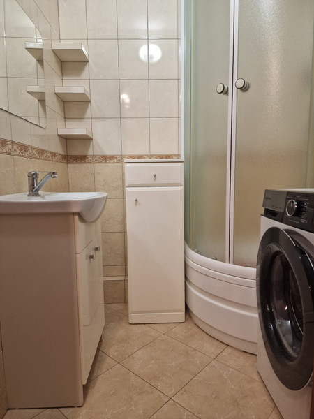 W łazience i WC od dołu do góry znajdują się płytki ceramiczne na ścianach oraz na podłodze. Łazienka wyposażona jest w kabinę prysznicową.