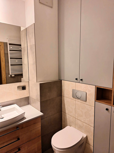 łazienki z wanną i toaletą oraz szafkami w zabudowie na wymiar