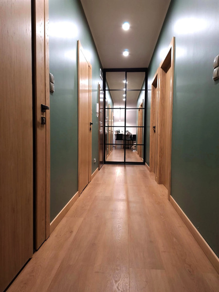 Wygładzone zostały wszystkie ściany w mieszkaniu i pomalowane na neutralne kolory (głównie biały – w salonie i w jednym z pokoi), jasny róż w pokoju dziecięcym, a także ciemnozielony akcent w korytarzu, co nadaje całemu mieszkaniu niezwykłego charakteru.