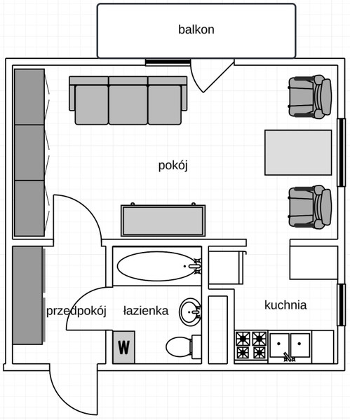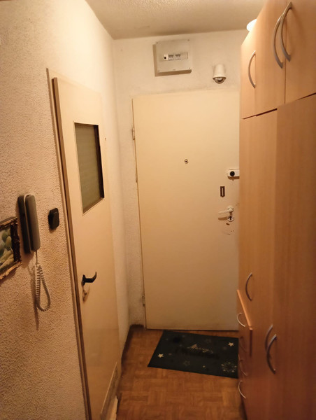 Mieszkanie wyposażone jest w podwójne drzwi wejściowe. Z korytarza przejście do łazienki z toaletą i – na wprost – do pokoju. Z pokoju (okna na dwu ścianach) przejście do kuchni. Z pokoju ponadto wyjście na balkon. Do mieszkania przynależy pomieszczenie piwniczne.