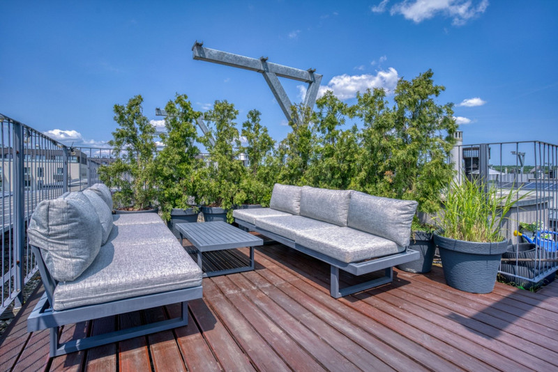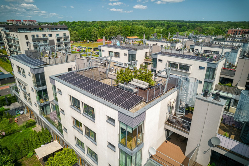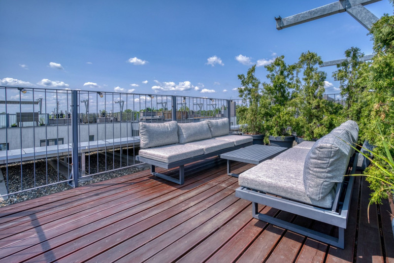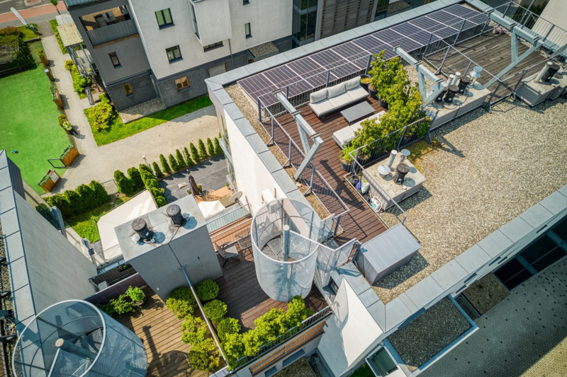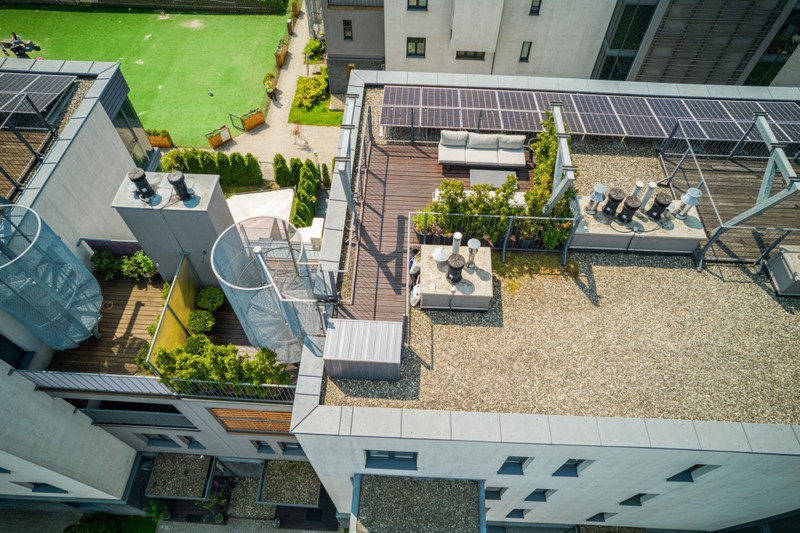 • górny na dachu budynku o pow. 20 m² – strefa relaksu, z możliwością aranżacji ogrodu, jacuzzi czy leżaków